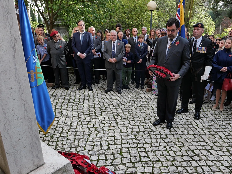 More than two hundred members of the diplomatic corps, armed services, veterans’ associations, schools, and the wider international community were present. The service featured the Exhortation read by Colonel Jonathan Dowd, the Last Post and Reveille, and hymns including “Praise, My Soul, the King of Heaven”, “I Vow to Thee, My Country”, and “Eternal Father, Strong to Save”.