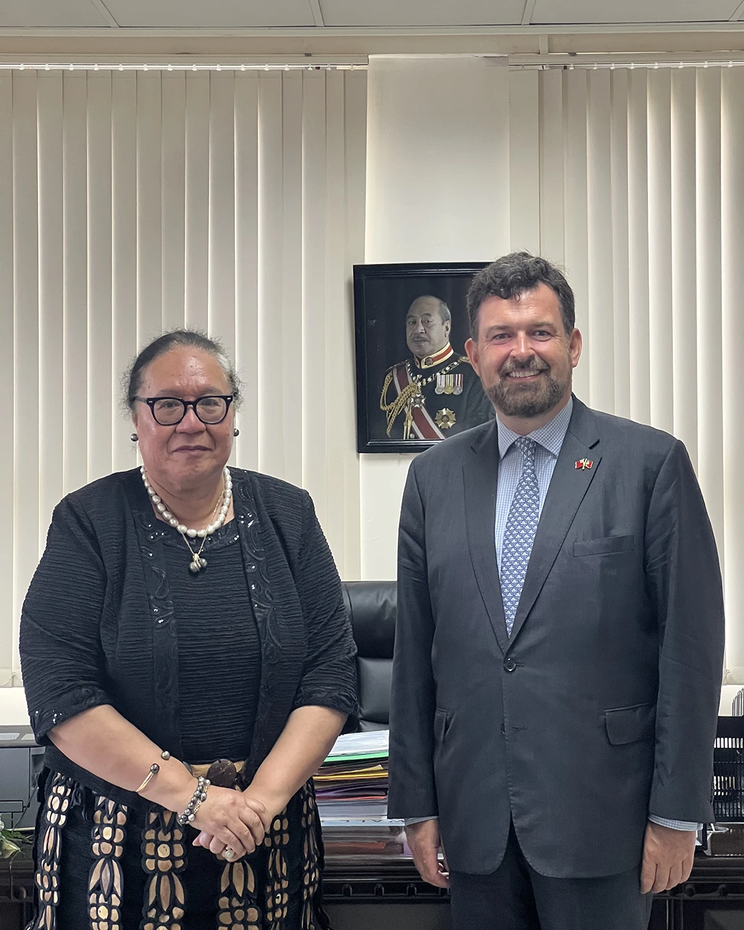 Nuku’alofa – julho de 2024. O Cônsul-Geral Honorário de Sua Majestade, Anthony Bailey, visitou Tonga e reuniu-se com a Honorável Fekitamoeloa Katoa ‘Utoukamanu, Ministra da Meteorologia, Energia, Informação, Gestão de Catástrofes, Ambiente, Alterações Climáticas, Comunicação e CERT (MEIDECC) do Reino de Tonga.